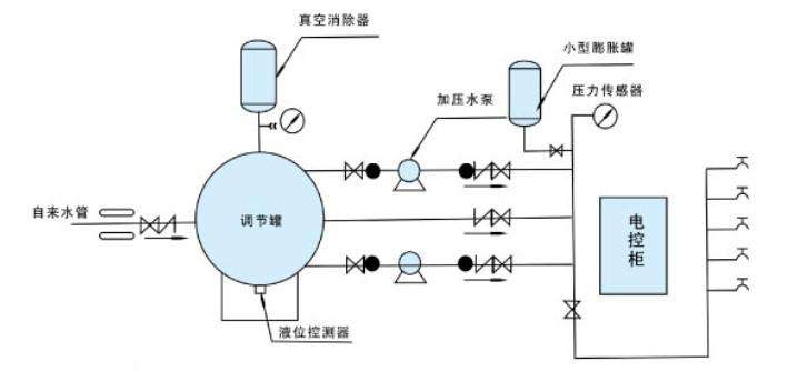 整套設備由穩流罐、真空抑制器、變頻調速水泵機組、壓力傳感器、變頻控制柜、倒流防止器(可選)、消毒裝置(可選)、小流量保壓罐(可選)等組成。從市政管網引來的進水管直接連接到穩流罐的進水口,穩流罐的出水口通過消毒裝置后連接到加壓泵組的進水管,加壓機組的出水管與用戶用水管連接,直接向用戶管網供水。
